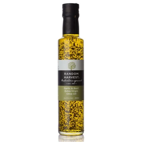 Random Harvest’s Garilc & Basil Extra Virgin Olive Oil, is the couture version of oil with its pungent overtones combined with the richness of the oil. Drizzle it over salads, meats and vegetables or follow the Italian and Greek tradition of pouring some in a bowl as a dipping sauce for bread.